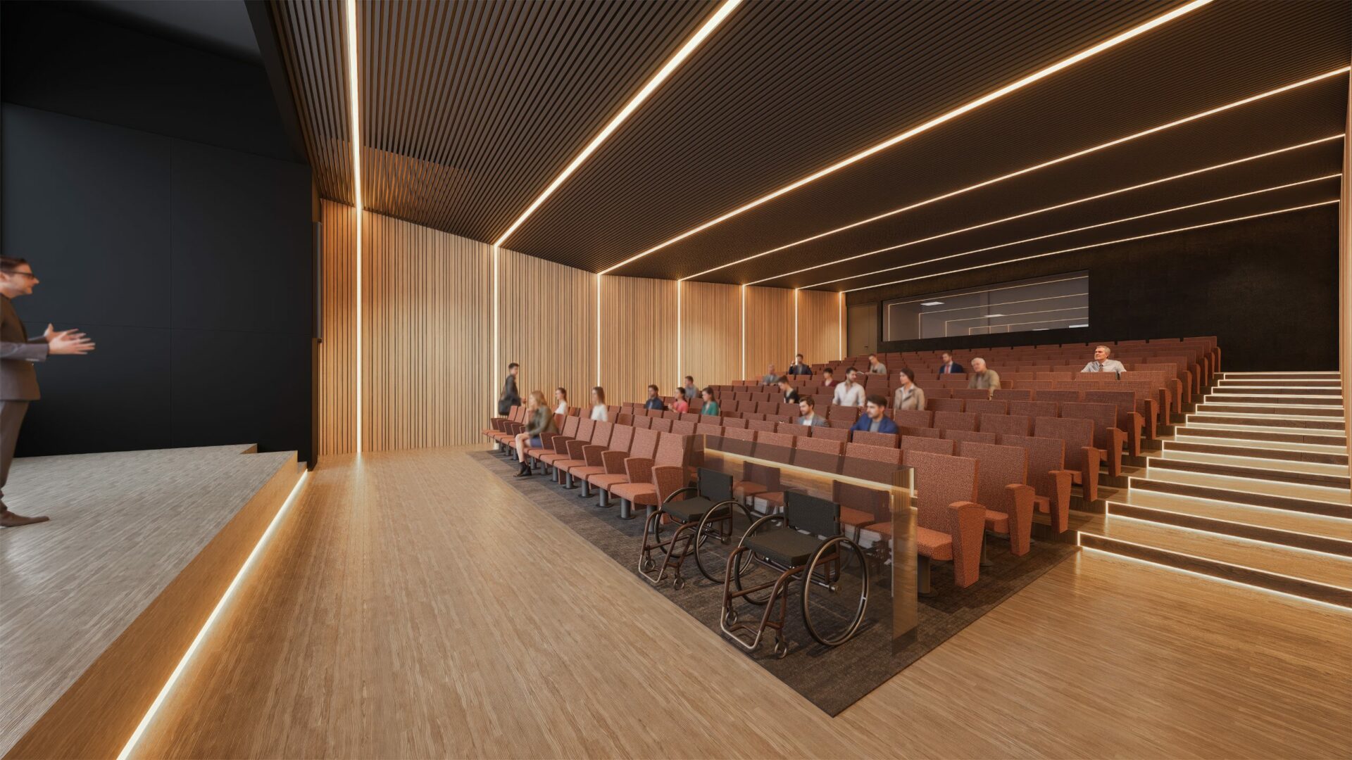 A 240-seat auditorium, widely adapted for PRM, was added to the ensemble. Taking up the codes of the Lobby, we wanted it to be warm and inviting. Acoustic wooden wall cladding was installed on the walls, while the red seats play on the bank’s graphic charter. The luminous arches surrounding the auditorium create a dynamic effect that reinforces the idea of comfort.