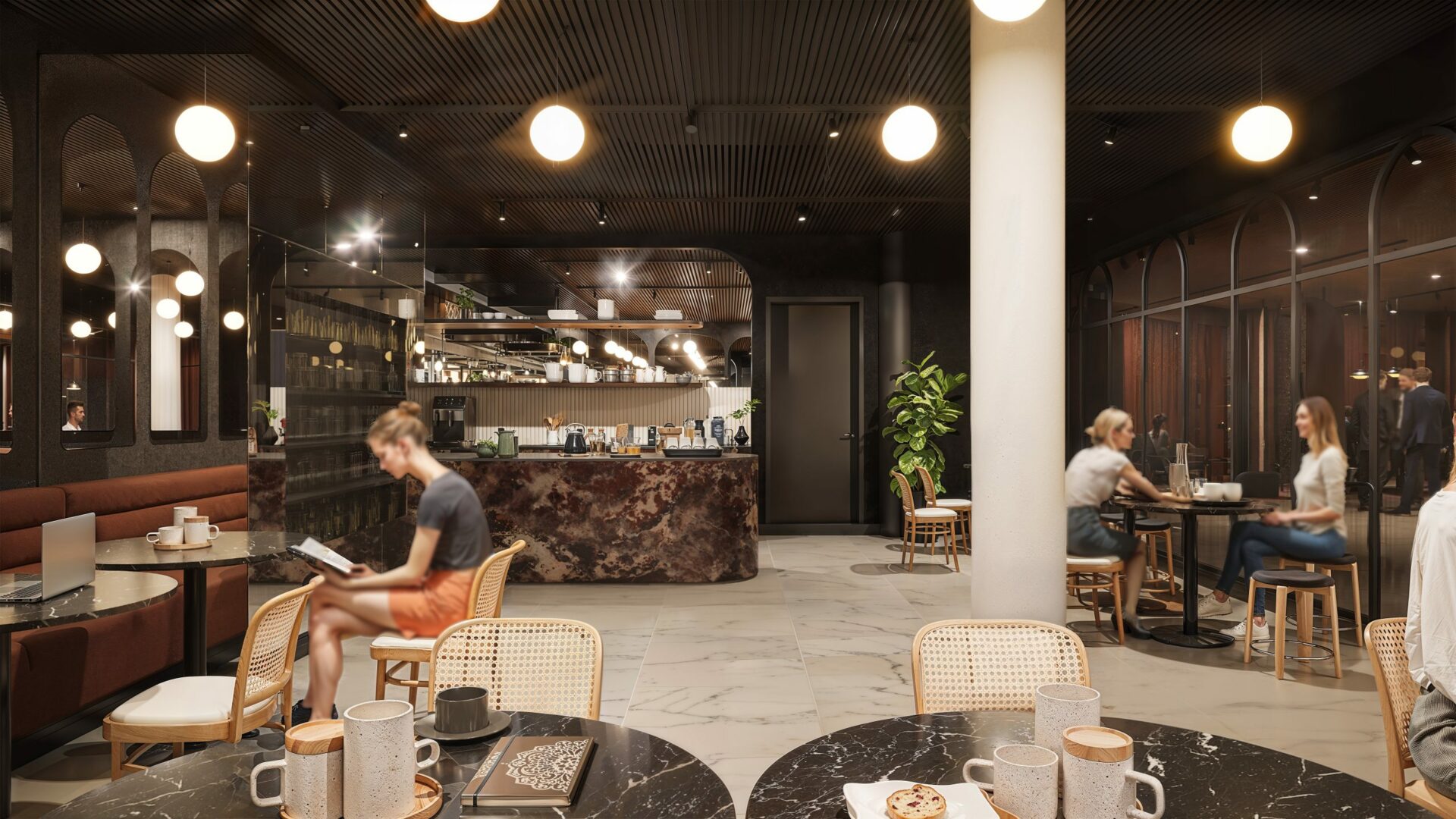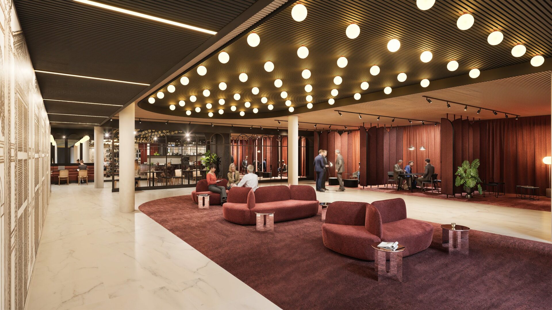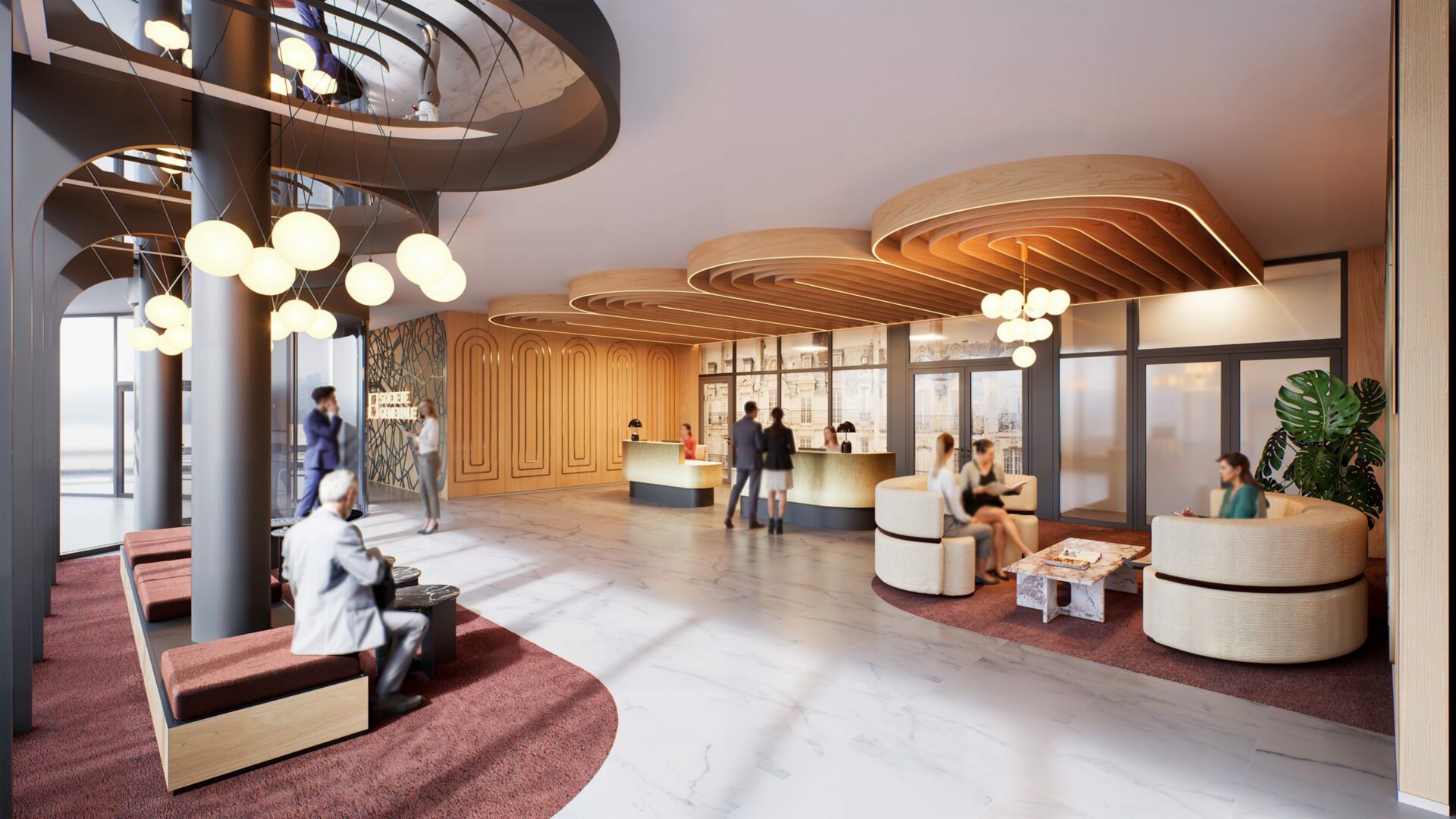 The lobby takes up all the codes of Haussmannian architecture, reprocessed in a very contemporary way, and is adorned with marble, moldings and brass, to create a link between France and Luxemburg.