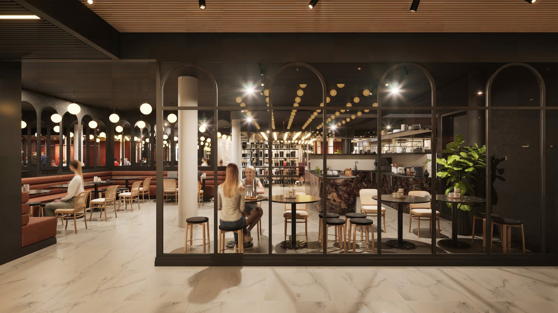 Like an Ariadne’s thread, the window continues into the Business Center, this time representing the street itself. Seating benches and a ceiling of mirrors were integrated throughout, adding volume to this modular, multifunctional space.