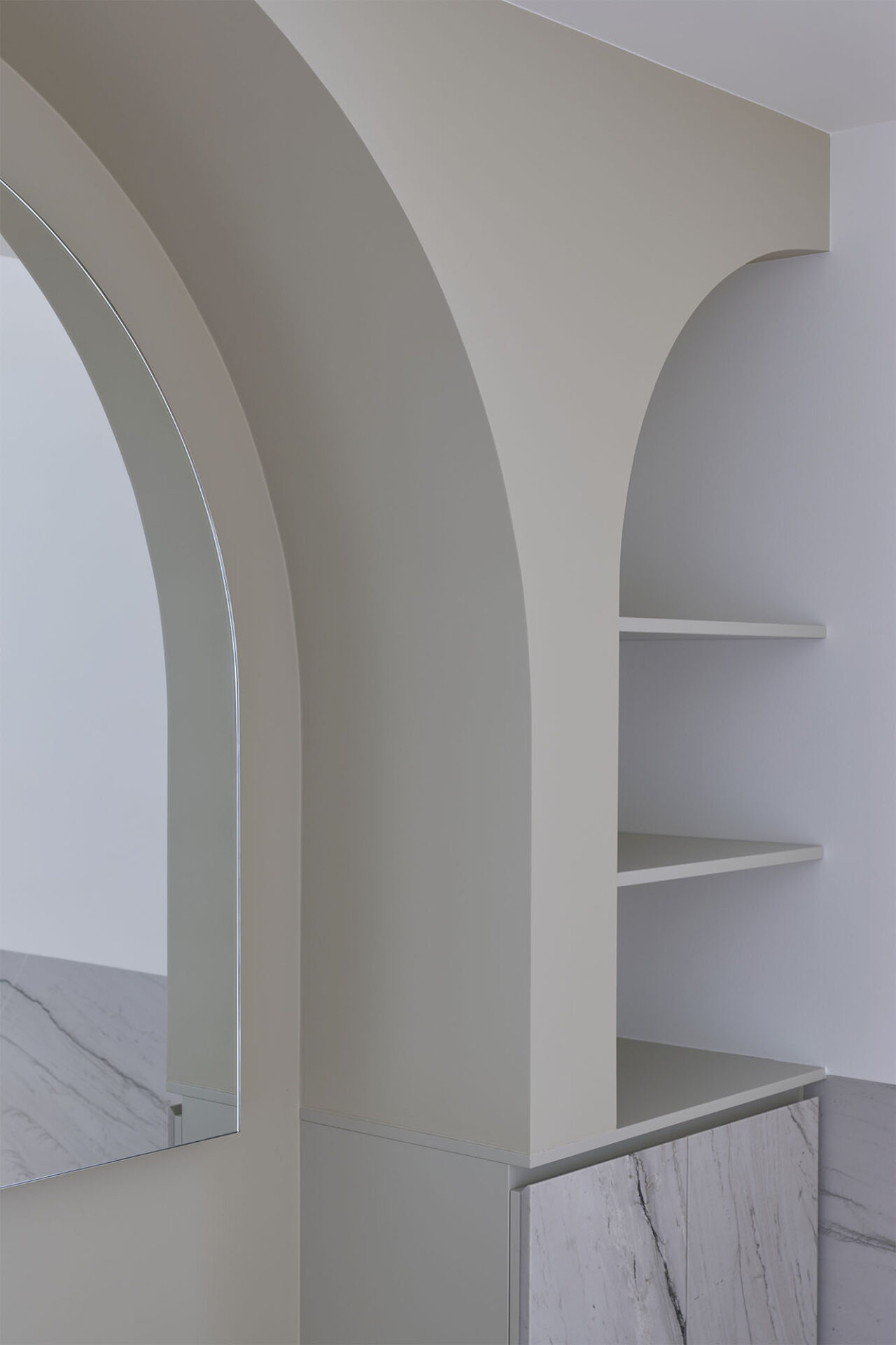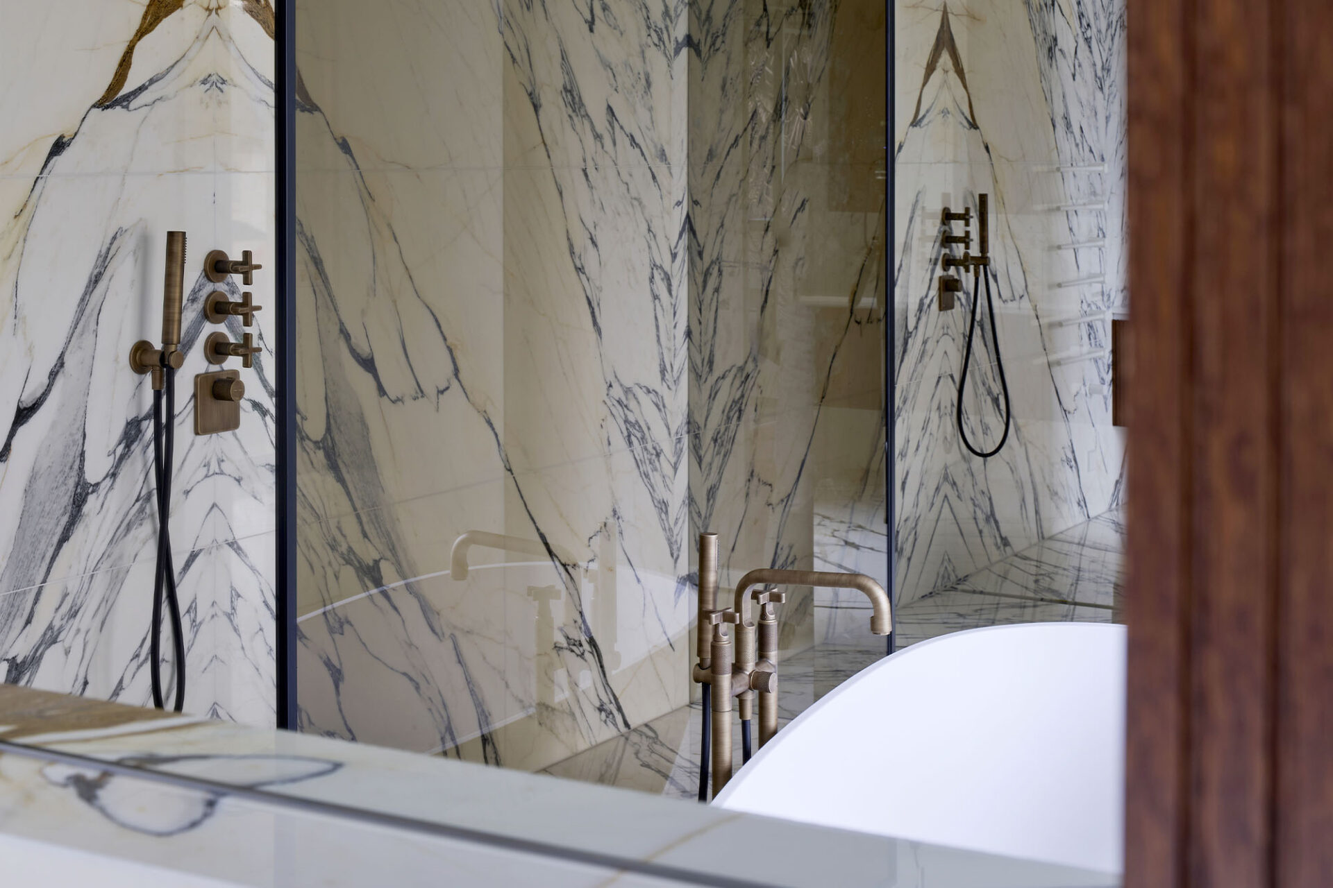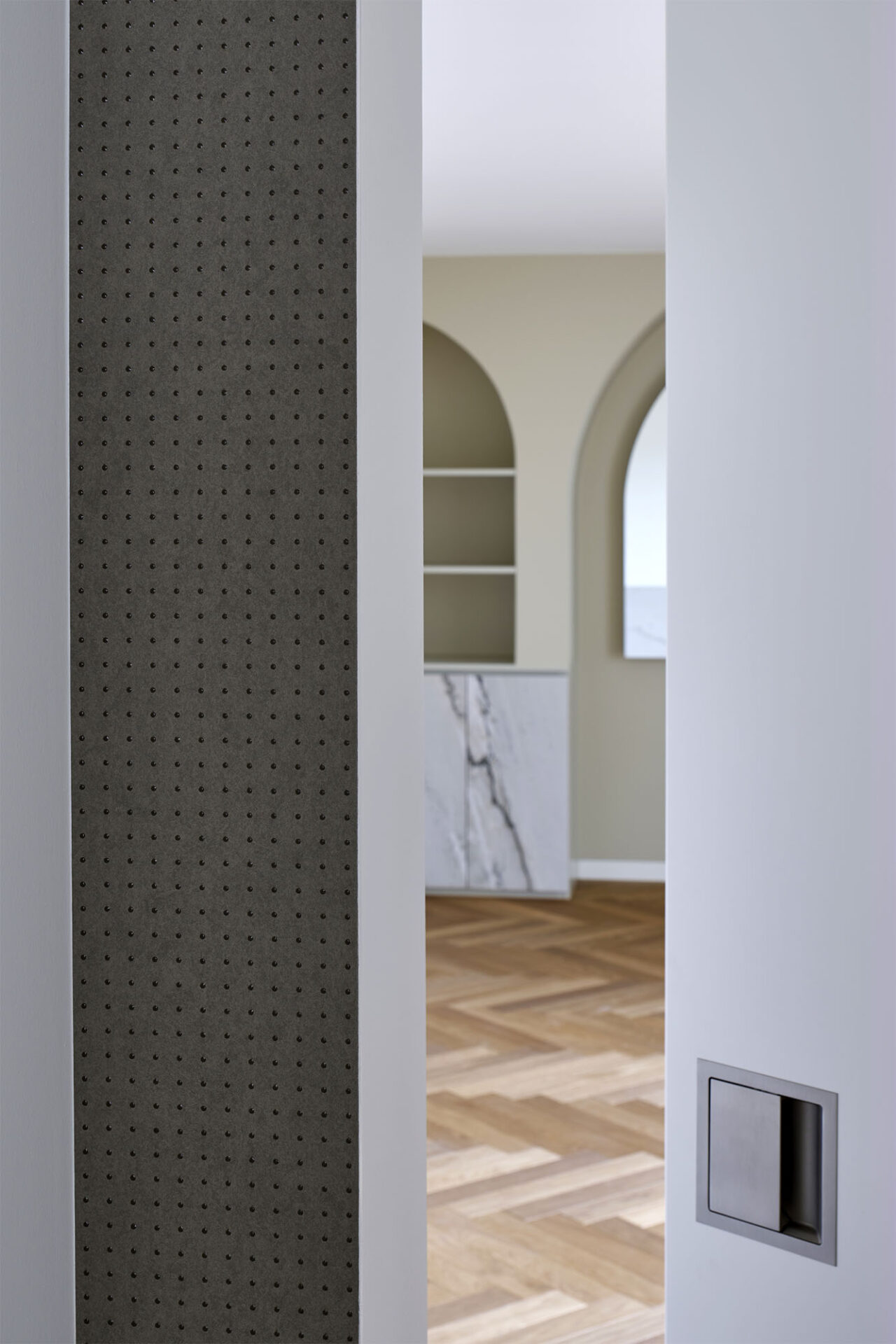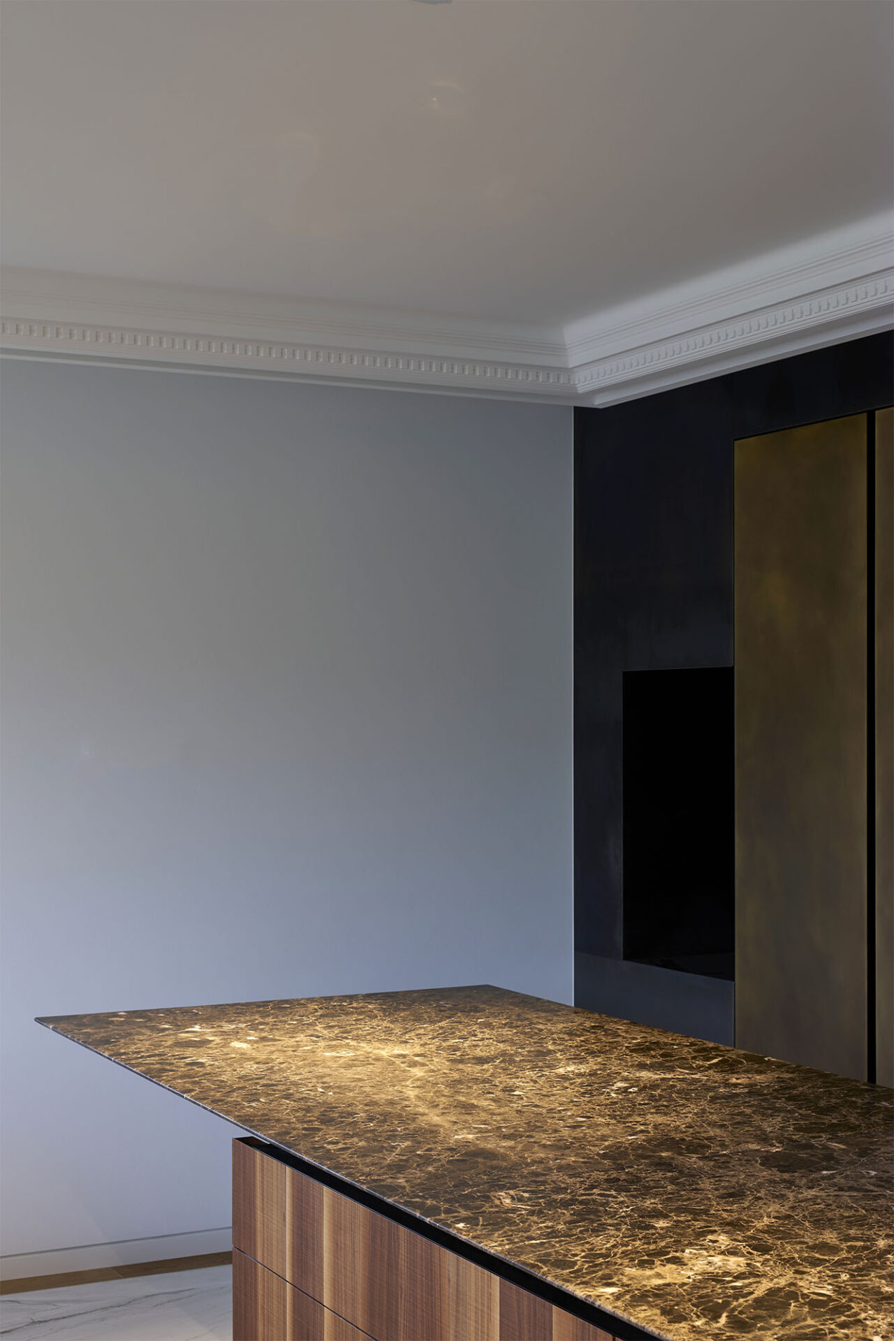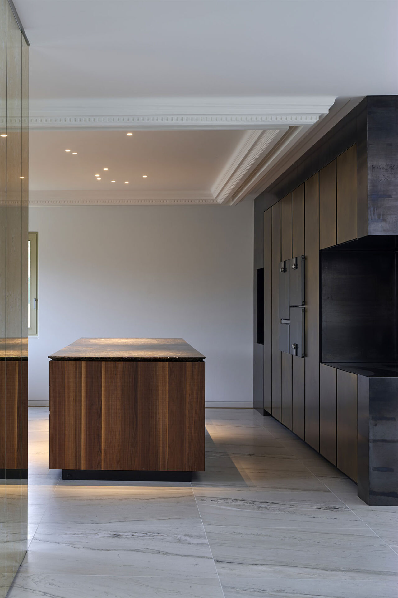 While the marble, laid in book match, gives it a resolutely majestic look, the herringbone parquet, the baseboards and the moldings reinforce its Haussmannian character. Mixing classical and contemporary elements, the spaces are particularly marked and require a lot of technicality in order to adapt to the client’s luxurious and epicurean lifestyle.